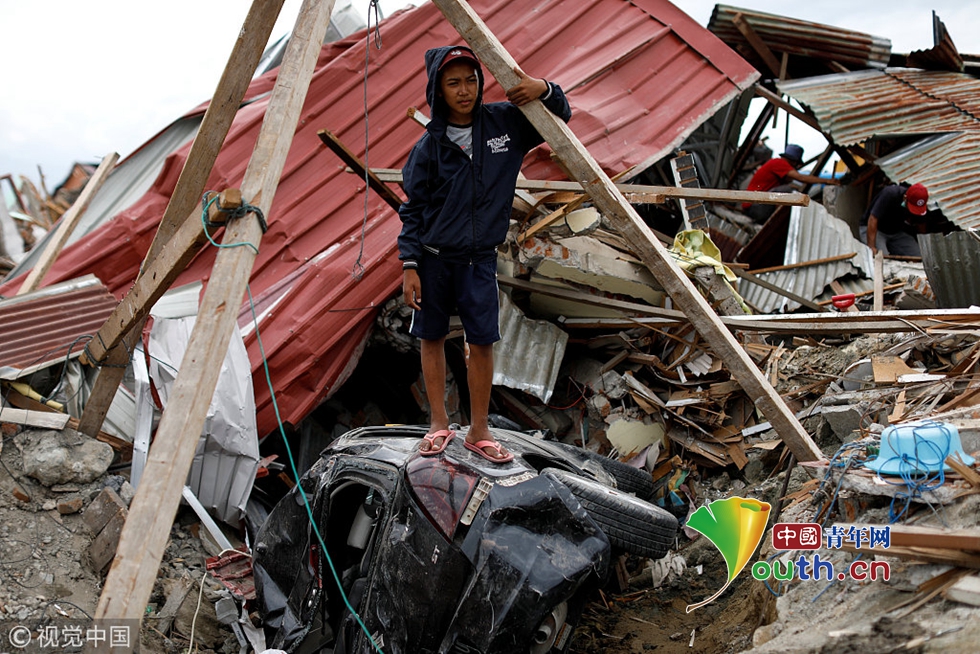 當(dāng)?shù)貢r(shí)間2018年10月11日,印尼帕盧,15歲的Ikhmal Yudanto站在他母親的汽車(chē)上,汽車(chē)在地震中被嚴(yán)重毀壞。