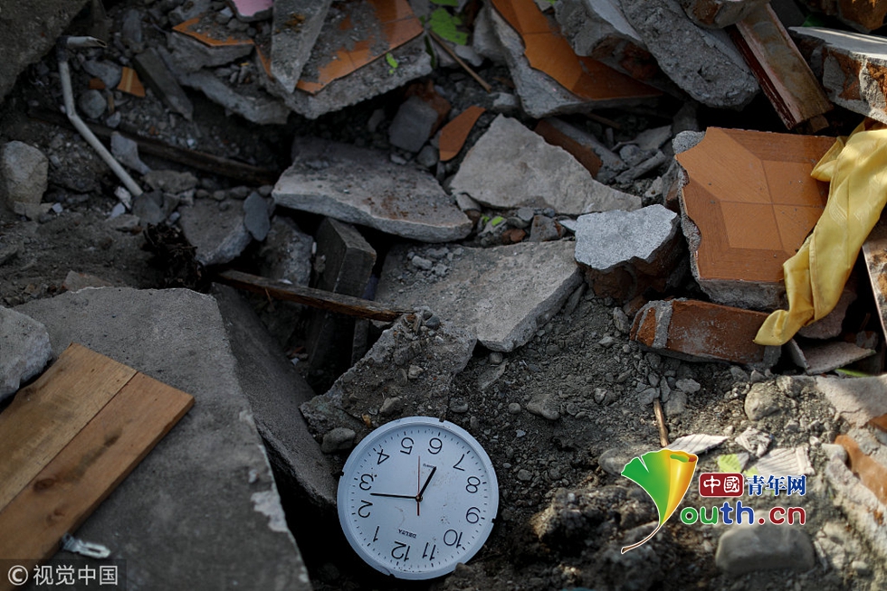 當(dāng)?shù)貢r(shí)間2018年10月7日,印尼帕盧,兩名男子從地震廢墟中找回他們?nèi)ナ栏改傅漠?huà)像。圖片作者:JORGE SILVA/視覺(jué)中國(guó)