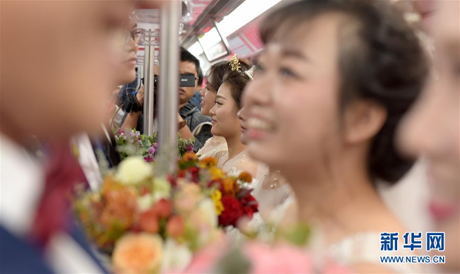 10月18日,在合肥市地鐵一號線車廂內,新人們互相許諾,期許愛情。 當日,中鐵四局集團城市軌道交通工程分公司的18對新人在安徽合肥地鐵一號線的車廂里舉行了一場集體婚禮儀式。 新華社記者 郭晨 攝