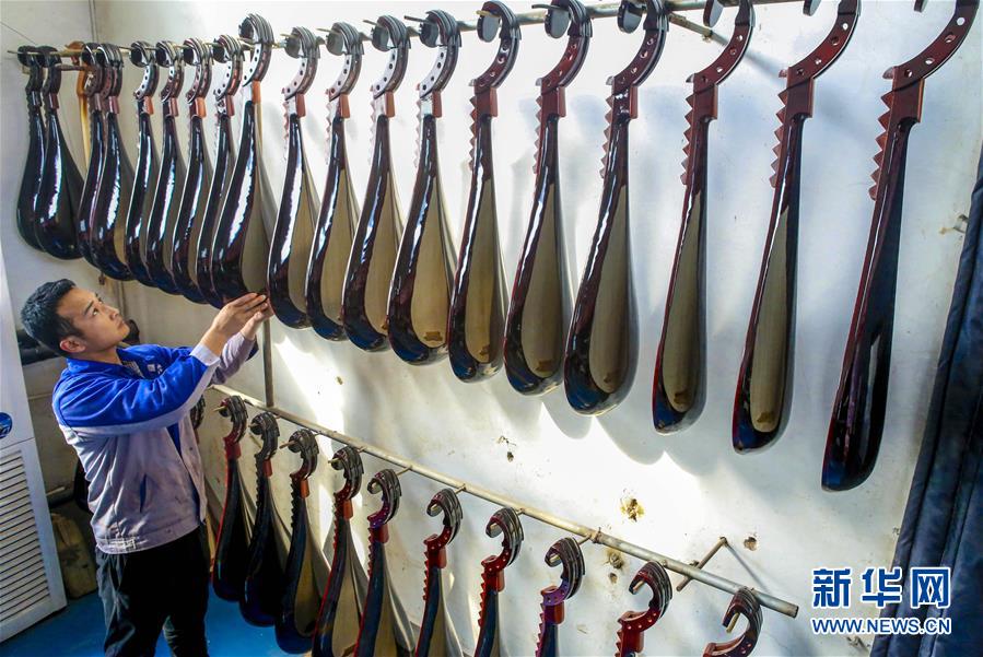 10月20日,在河北省饒陽縣一家民族樂器廠,工人擺放琵琶半成品。