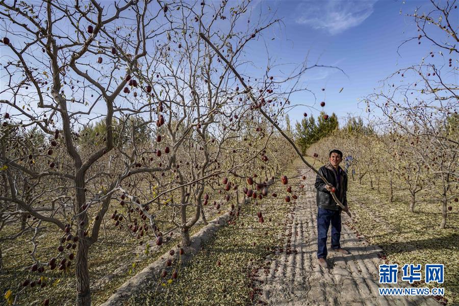 10月20日,在且末縣阿熱勒鎮(zhèn)有機紅棗園里,棗農在打棗。 新華社記者 趙戈 攝