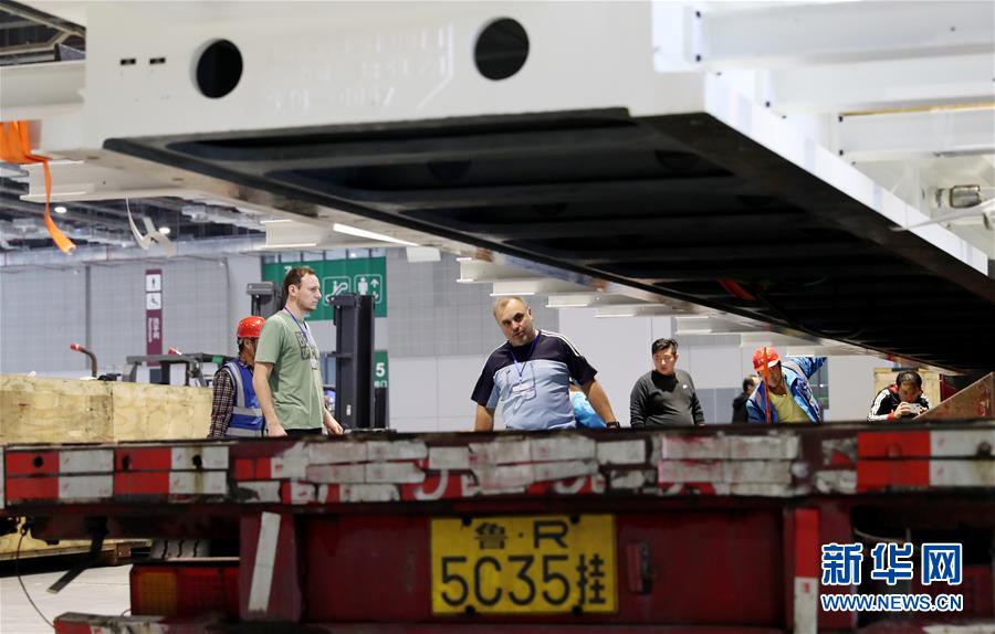 10月22日,德國工程師馬丁·霍爾茨海德(中)在吊裝過程中查看“金牛座”龍門銑床床身位置。 當日,來自德國的首屆進口博覽會最大展品——“金牛座”龍門銑床完成初步組裝,將運往國家會展中心(上海)3號館進行最后的安裝施工。這是德國瓦德里希科堡公司研發(fā)的機床設備,高約8米,占地面積約200平方米,將在智能及高端裝備區(qū)進行展出。 新華社記者方喆攝