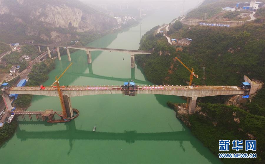 10月23日,在重慶涪陵,施工人員在渝懷鐵路涪秀二線重點(diǎn)工程——烏江右線大橋主跨合龍現(xiàn)場作業(yè)。 當(dāng)日,由中鐵四局承建的渝懷鐵路涪秀二線重點(diǎn)工程——烏江右線大橋主跨成功合龍,標(biāo)志著大橋主體工程全部順利結(jié)束。烏江右線大橋項(xiàng)目全程460.1米,主跨192米,跨越烏江和319國道。在兩年多的建設(shè)過程中,施工人員攻克了“不等高墩”“不對(duì)稱邊跨”“邊跨入隧”等多個(gè)技術(shù)難題。 新華社記者王全超攝