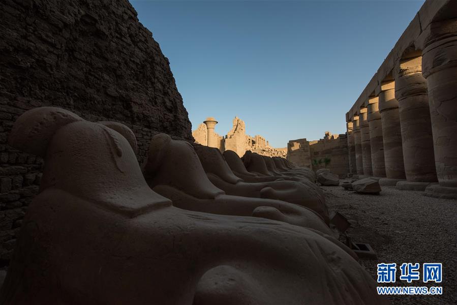 這是10月23日在埃及盧克索拍攝的卡納克神廟內(nèi)的石柱與雕像。新華社記者 孟濤 攝