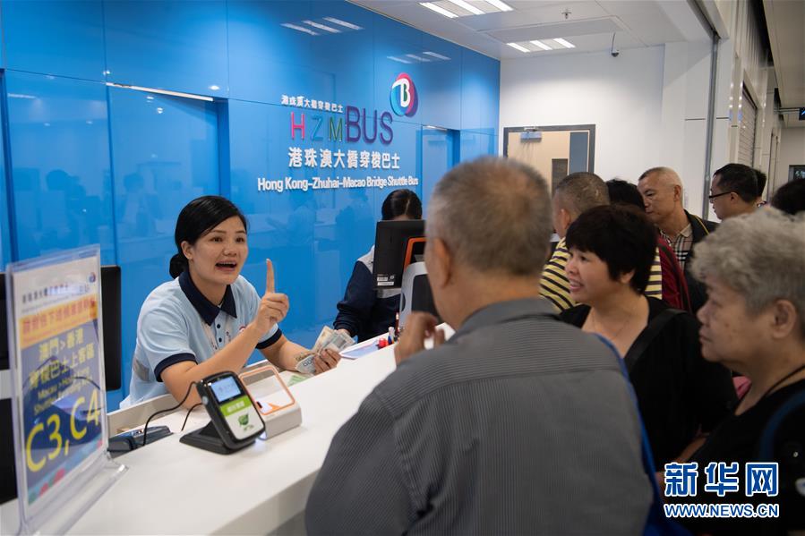 10月24日,市民在澳門離境大堂穿梭巴士售票處購(gòu)買車票。 當(dāng)日,港珠澳大橋正式通車。
