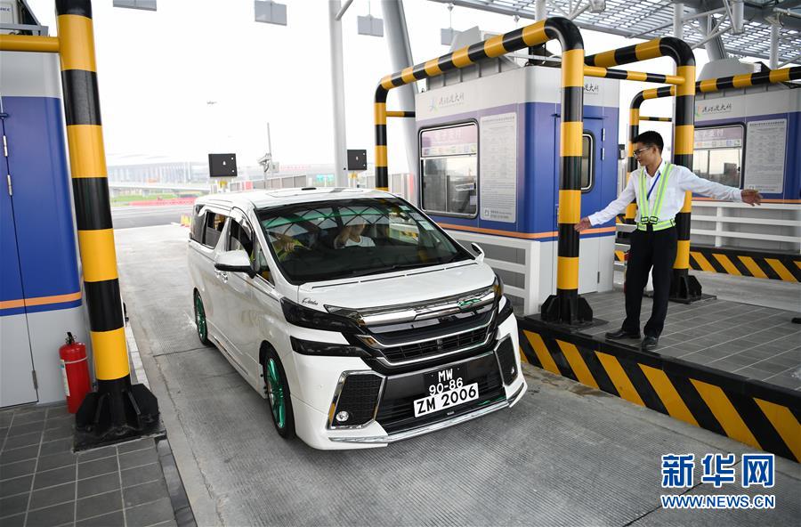 10月24日,首輛私家車在澳門口岸離境車道上通關(guān)。當(dāng)日9時(shí),港珠澳大橋正式通車。 新華社記者張金加攝