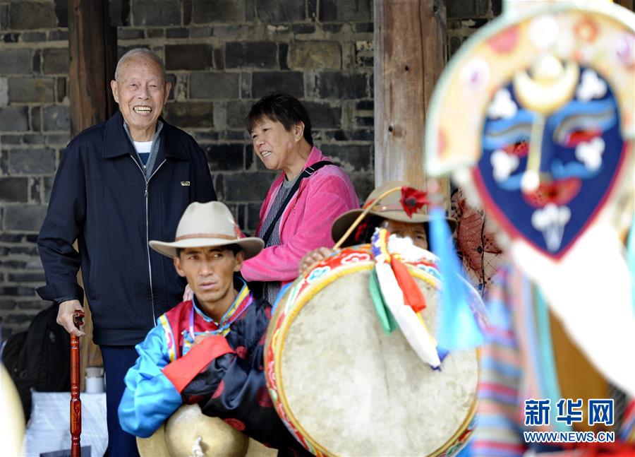 在浙江烏鎮(zhèn)西柵景區(qū)的安渡坊碼頭廣場的涼亭下,來自無錫的90歲鄧氏老人(左一)觀看藏戲表演(10月26日攝)。新華社記者 張汝鋒 攝