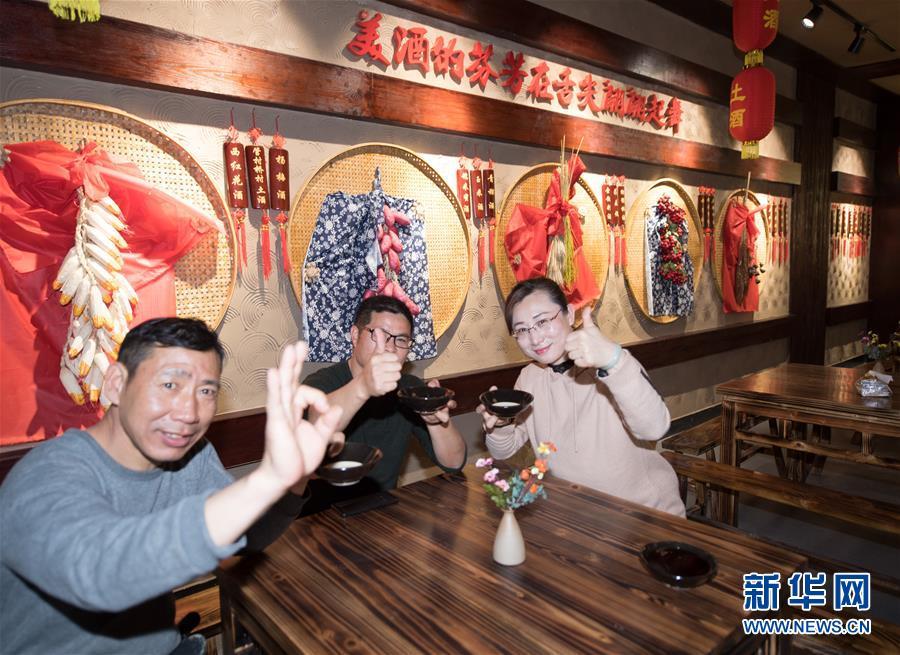 游客在浙江省建德市大同鎮(zhèn)管村橋村文化禮堂品嘗該村特產(chǎn)土酒(2018年3月13日)。2017年起,建德市對農(nóng)村文化禮堂建設(shè)進行“一村一品”提升改造,打造惠民、育德、展示等為一體的文化禮堂,嘗試“鄉(xiāng)村文創(chuàng)客廳”建設(shè),促進鄉(xiāng)村振興。新華社記者 翁忻旸 攝