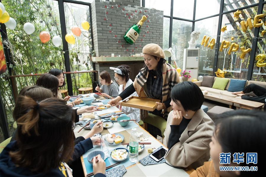 在浙江省杭州市外桐塢村,民宿主人龐代君(右三)在她創(chuàng)立于2016年的“畫·鄉(xiāng)院”精品民宿為客人送早餐(2018年1月3日攝)。外桐塢村是西湖西面群山中的一個(gè)小村落,傳統(tǒng)以茶葉生產(chǎn)為主要經(jīng)濟(jì)來源,自2010年以來著力打造藝術(shù)村落,目前已擁有藝術(shù)家工作室43個(gè)、高檔民宿7家、美術(shù)館和展廳3家。新華社記者 翁忻旸 攝