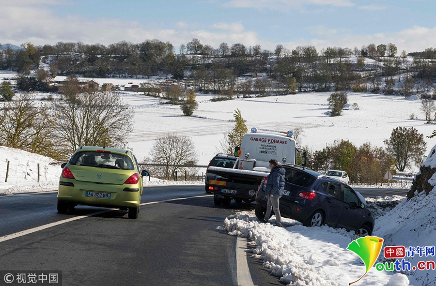 當(dāng)?shù)貢r間2018年10月30日,法國菲克斯圣熱內(nèi),當(dāng)?shù)赝唤荡笱?,?dǎo)致950人被困在大雪覆蓋的公路上,不得不睡在緊急救援中心。法國國家氣象局已經(jīng)將當(dāng)?shù)刂糜诔壬踩渲隆?/p>