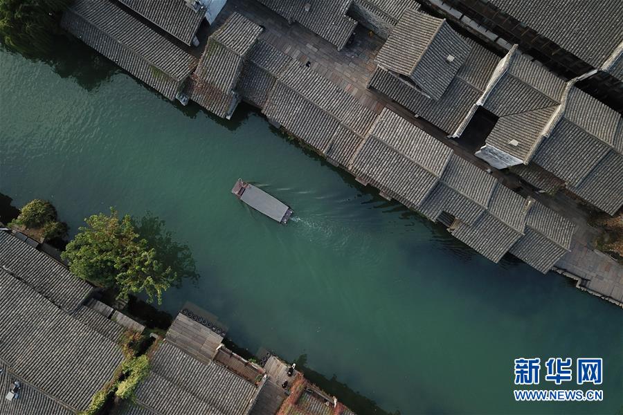 10月18日,游船行駛在烏鎮(zhèn)水道上(無(wú)人機(jī)拍攝)。新華社記者翁忻旸攝
