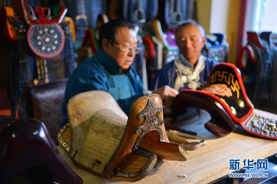 10月31日,在內(nèi)蒙古自治區(qū)通遼市科爾沁左翼后旗,套格敦白乙(左)向徒弟關(guān)嘎扎布傳授制作馬鞍的技巧。新華社記者鄒予攝