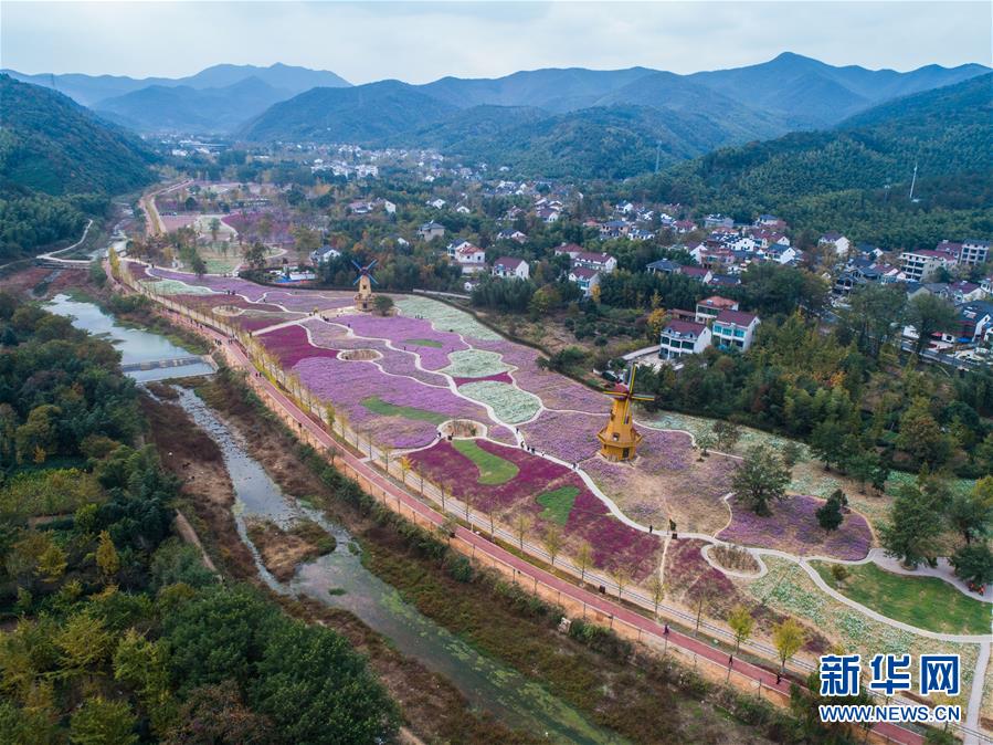 11月2日,空中俯瞰小浦鎮(zhèn)的“五彩花?!?,多彩的花海與金黃的銀杏林構成了一幅美麗的秋季風景(無人機拍攝)。 新華社記者 徐昱 攝