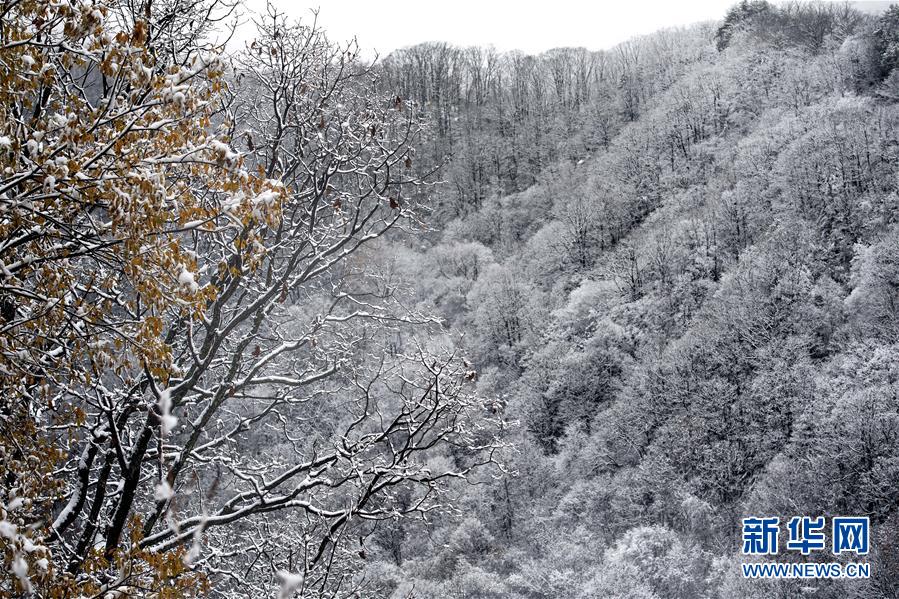 11月5日無人機(jī)拍攝的陜西省漢中市佛坪縣涼風(fēng)埡景區(qū)雪景。 新華社記者陶明攝