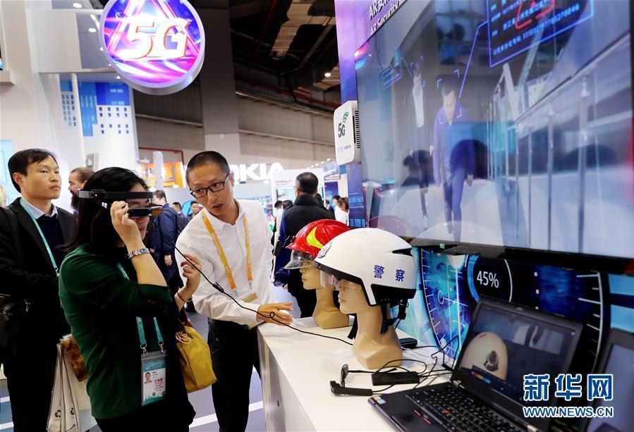 11月5日,一名參觀者(左)在諾基亞展臺體驗(yàn)一款基于5G通信技術(shù)的AR安防系統(tǒng)終端設(shè)備。 新華社記者 方喆 攝