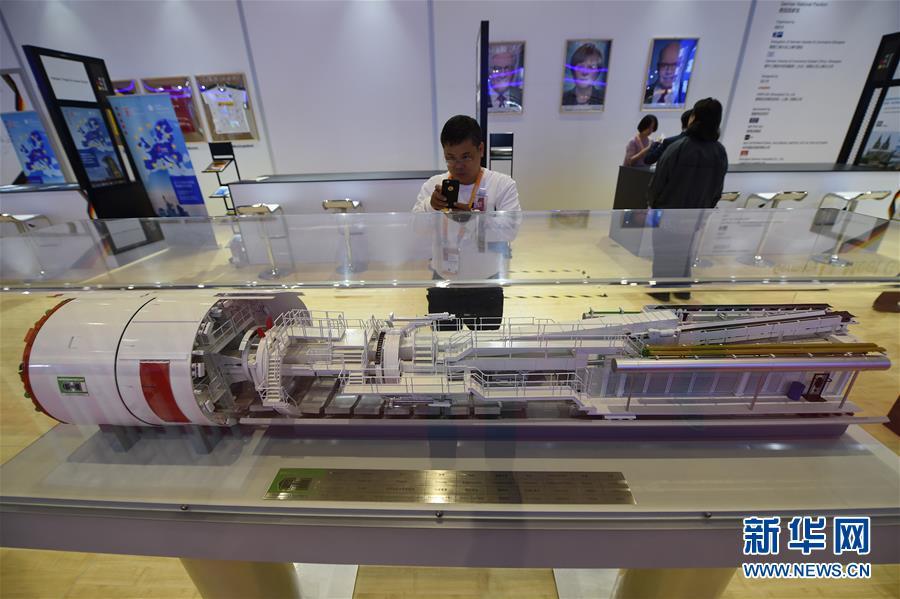 11月5日,一名參觀者在德國展館內(nèi)拍攝雙護盾盾構機模型。 新華社記者 韓瑜慶 攝