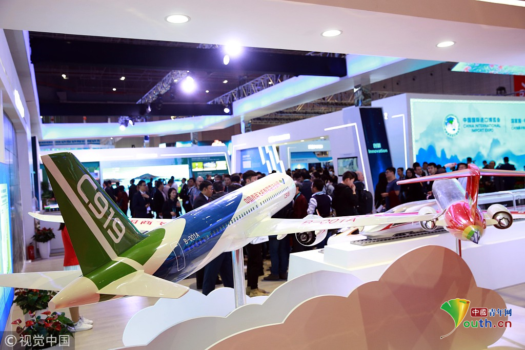2018年11月6日,上海,首屆中國國際進(jìn)口博覽會(huì)國家展上,共有82個(gè)國家、3個(gè)國際組織設(shè)立了71個(gè)展臺(tái)。中國館展示的C919飛機(jī)。視覺中國