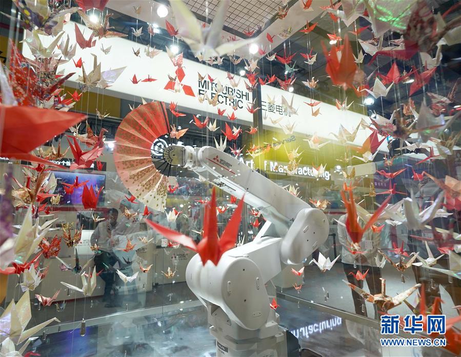 11月6日,日本三菱電機(jī)公司展臺(tái)上的扇子舞機(jī)器人進(jìn)行表演。 新華社記者 陳建力 攝