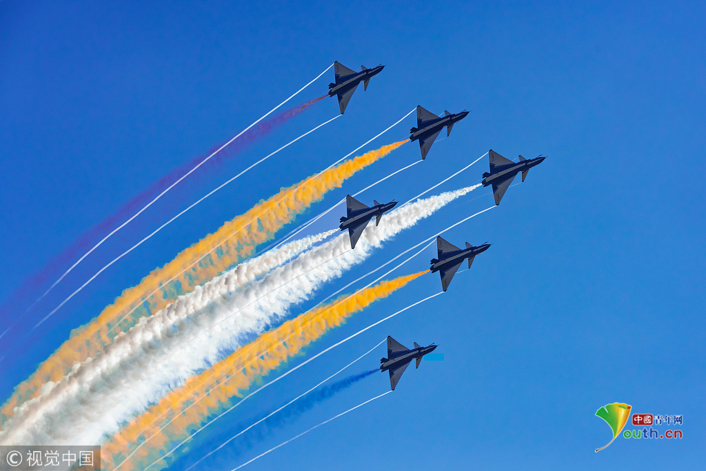 2018年11月6日,第十二屆中國(guó)國(guó)際航空航天博覽會(huì)在珠海拉開帷幕。八一飛行表演隊(duì)的殲-10率先上陣,為觀眾獻(xiàn)上精彩的飛行表演。視覺中國(guó)