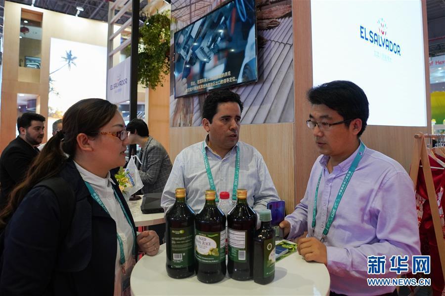 11月7日,在薩爾瓦多展區(qū),一名參觀者(左)聽取工作人員推介當(dāng)?shù)厣a(chǎn)的諾麗果汁。 中國國際進口博覽會11月5日在上海開幕。國家貿(mào)易投資綜合展(國家展)是中國國際進口博覽會的重要內(nèi)容,共有82個國家、3個國際組織設(shè)立71個展臺。 新華社記者 王天聰 攝