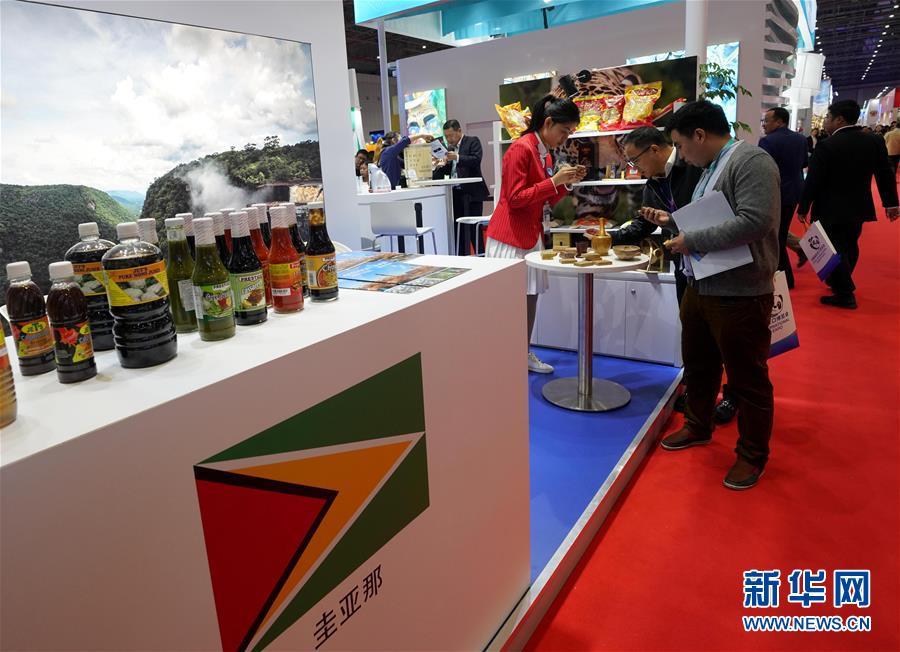 11月8日,在加勒比地區(qū)國家展區(qū)圭亞那展臺,參觀者與工作人員交談。 中國國際進口博覽會11月5日在上海開幕。國家貿(mào)易投資綜合展(國家展)是中國國際進口博覽會的重要內(nèi)容,共有82個國家、3個國際組織設(shè)立71個展臺。 新華社記者 程麗 攝