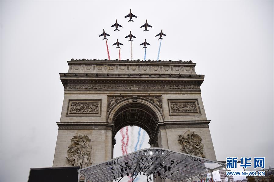 11月11日,在法國巴黎,“法蘭西巡邏兵”飛行表演隊在紀(jì)念儀式上飛過凱旋門。當(dāng)日,法國政府在巴黎凱旋門前舉行儀式,隆重紀(jì)念第一次世界大戰(zhàn)結(jié)束一百周年。新華社記者 陳益宸 攝
