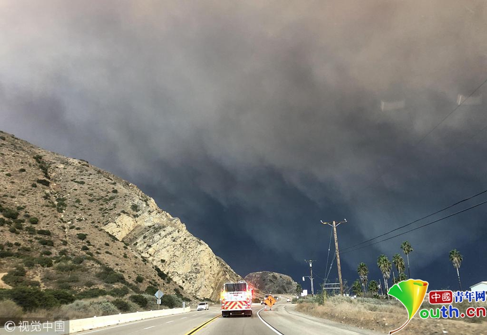 當?shù)貢r間11月9日下午,美國加利福尼亞州南部文圖拉郡(Ventura County)等地熊熊山火已延燒逾萬英畝,濃煙遮天蔽日。