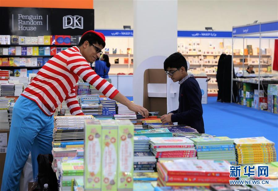 11月14日,在科威特國(guó)際展覽中心,工作人員(左)向一個(gè)男孩介紹圖書。 第43屆科威特國(guó)際書展14日在科威特國(guó)際展覽中心開幕,共有來自26個(gè)國(guó)家和地區(qū)的505家出版機(jī)構(gòu)參展。 新華社記者 聶云鵬 攝