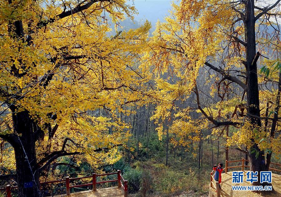 11月1日,游客在河南省嵩縣白河鄉(xiāng)下寺村古銀杏樹(shù)下拍照賞景。 深秋時(shí)節(jié),河南省嵩縣白河鄉(xiāng)下寺村的古銀杏林為小山村披上了“金甲”。漫天黃葉,遍地金色,一幢幢民居掩映在色彩斑斕的世界里,美不勝收,吸引了眾多游客賞景拍照。 新華社記者 李安 攝