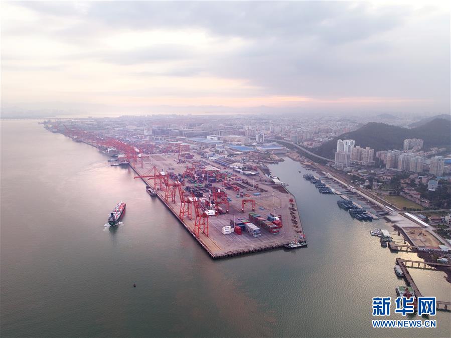 福建自貿(mào)區(qū)廈門片區(qū)東渡港區(qū),一艘貨輪向碼頭靠攏(2017年8月26日無人機拍攝)。新華社記者姜克紅攝