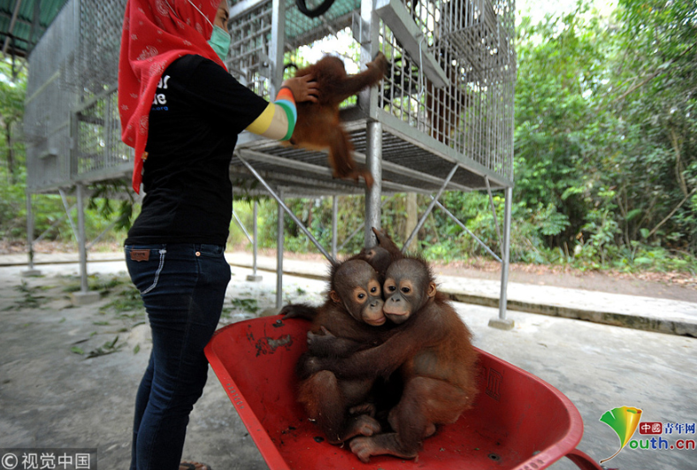 當(dāng)?shù)貢r(shí)間2018年9月18日,印尼加里曼丹克塔邦,國際動(dòng)物救援(IAR)猩猩安全與保護(hù)中心里,飼養(yǎng)員用獨(dú)輪車把猩猩寶寶送到森林學(xué)校。圖片作者:Newscom