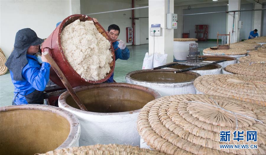11月21日,工作人員在紹興女兒紅釀酒有限公司釀酒廠房將剛煮熟的糯米落缸。 浙江紹興一帶有“生女釀好酒、婚嫁宴賓客”的習(xí)俗,所釀之酒稱“女兒紅”。在紹興市上虞區(qū)東關(guān)街道,一家釀酒廠仍保留著傳統(tǒng)的黃酒生產(chǎn)線,恪守著近20道釀造工序,延續(xù)著傳統(tǒng)黃酒的釀制技藝和生女必釀“女兒紅”的文化習(xí)俗。 黃酒是中國(guó)最古老的酒種之一,傳統(tǒng)黃酒僅在冬季取鑒湖水和糯米釀制,所得之酒澄澈馥郁。 新華社記者翁忻旸攝