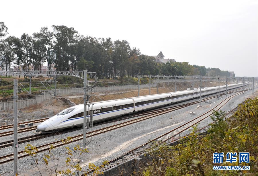 廣西桂林至北京高鐵列車(chē)在桂林市靈川縣境內(nèi)行駛(2013年12月28日攝)。 廣西壯族自治區(qū)成立60年來(lái),鐵路建設(shè)發(fā)生翻天覆地的變化。來(lái)自中國(guó)鐵路南寧局集團(tuán)有限公司的數(shù)據(jù)顯示,1958年廣西鐵路總里程為1346.3公里,如今廣西鐵路總里程達(dá)5191公里。廣西與周邊相鄰省份間實(shí)現(xiàn)動(dòng)車(chē)“公交化”開(kāi)行。此外,北部灣港—重慶班列、東盟海產(chǎn)品冷鏈班列、“百色一號(hào)”果蔬專(zhuān)列等的開(kāi)通和運(yùn)營(yíng),強(qiáng)化了鐵路供給的針對(duì)性和有效性。鐵路成為助推廣西經(jīng)濟(jì)社會(huì)快速發(fā)展的“大動(dòng)脈”。 新華社記者陸波岸攝