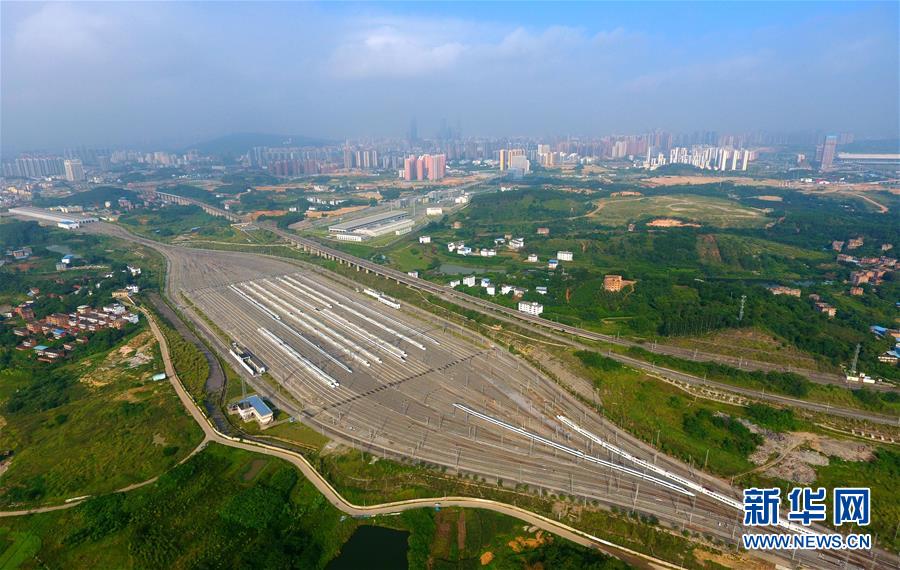 這是廣西南寧動(dòng)車(chē)所內(nèi)準(zhǔn)備發(fā)往各地的動(dòng)車(chē)組列車(chē)(7月1日無(wú)人機(jī)拍攝)。 廣西壯族自治區(qū)成立60年來(lái),鐵路建設(shè)發(fā)生翻天覆地的變化。來(lái)自中國(guó)鐵路南寧局集團(tuán)有限公司的數(shù)據(jù)顯示,1958年廣西鐵路總里程為1346.3公里,如今廣西鐵路總里程達(dá)5191公里。廣西與周邊相鄰省份間實(shí)現(xiàn)動(dòng)車(chē)“公交化”開(kāi)行。此外,北部灣港—重慶班列、東盟海產(chǎn)品冷鏈班列、“百色一號(hào)”果蔬專(zhuān)列等的開(kāi)通和運(yùn)營(yíng),強(qiáng)化了鐵路供給的針對(duì)性和有效性。鐵路成為助推廣西經(jīng)濟(jì)社會(huì)快速發(fā)展的“大動(dòng)脈”。 新華社記者黃孝邦攝