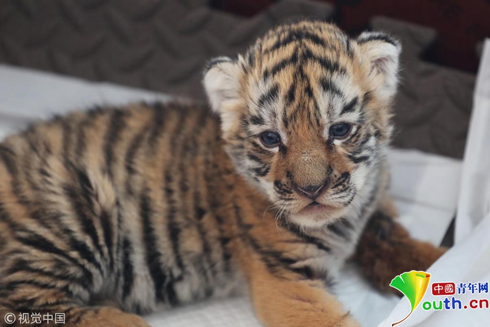 剛出生一個多月的小東北虎和“虎媽”在一起。