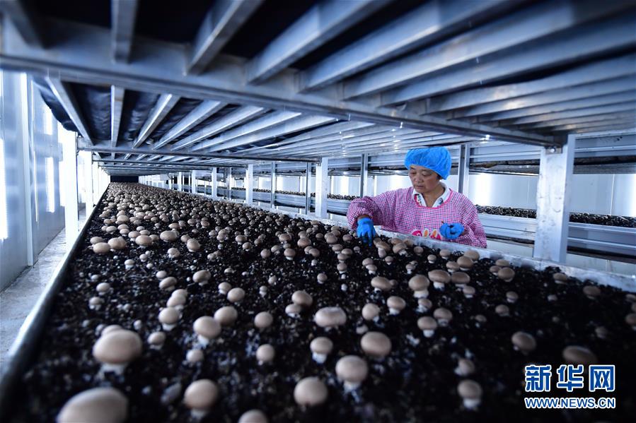 在河南蘭考縣東壩頭鄉(xiāng)張莊村,一位村民正在一個食用菌企業(yè)的車間內(nèi)采摘褐蘑菇(6月21日攝)。新華社記者馮大鵬攝