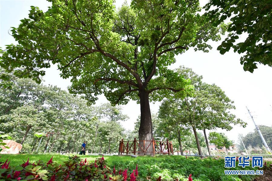 在河南蘭考縣焦裕祿干部學院門口,游客從“焦桐”下走過(2017年8月9日攝)。新華社記者馮大鵬攝