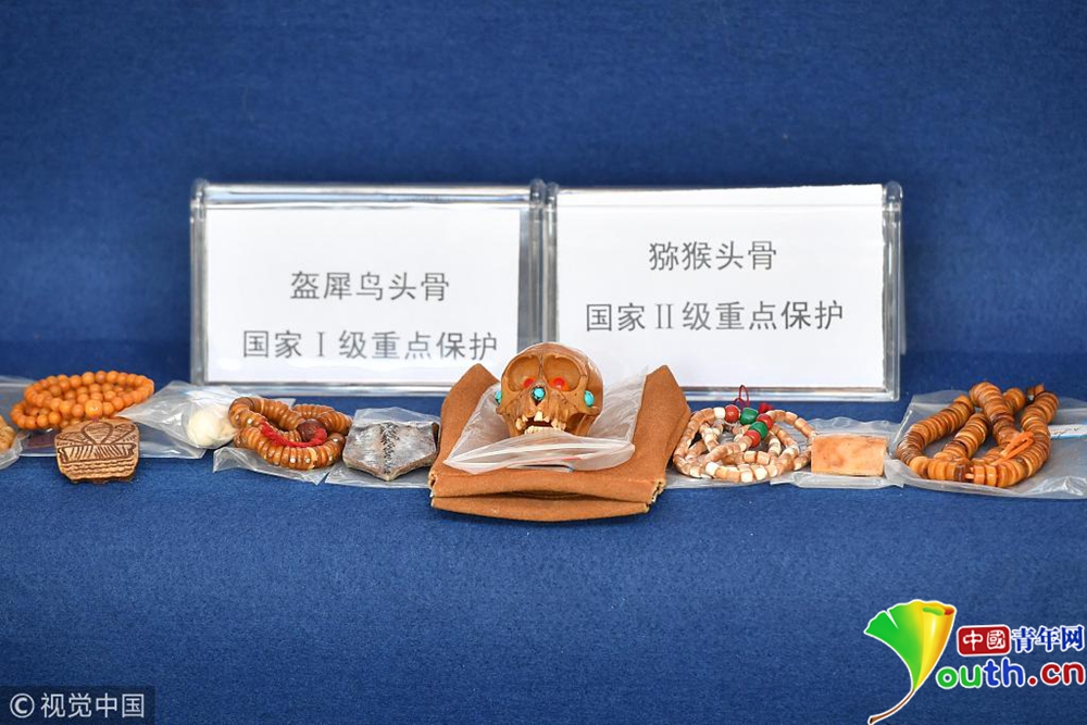 警方查獲的獼猴和盔犀鳥頭骨制品。