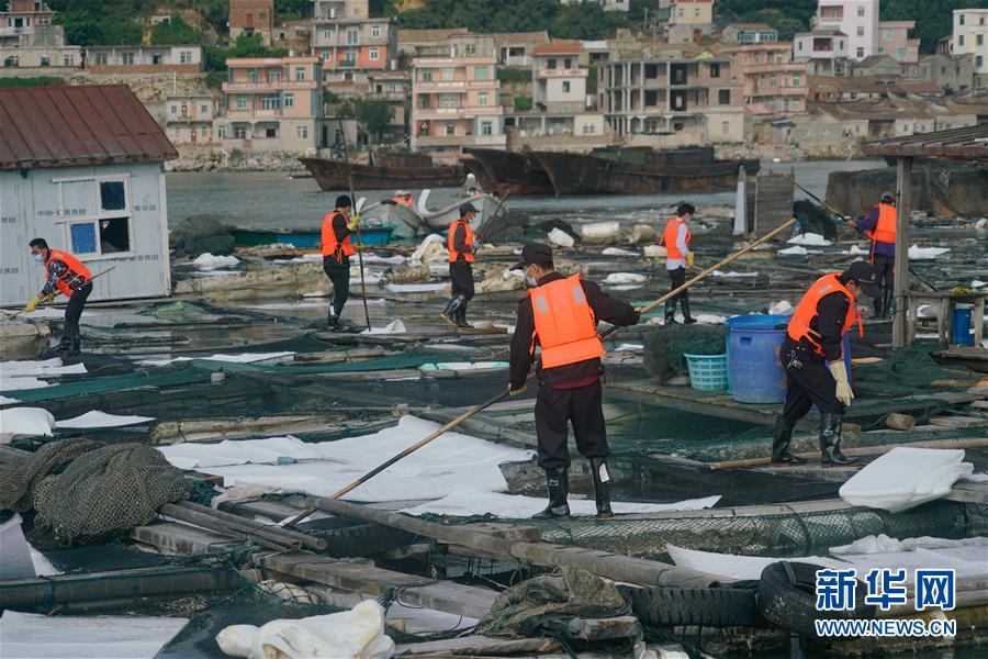 在福建省泉州市泉港區(qū)南埔鎮(zhèn)肖厝村附近海域漁排上,工作人員在清理漂浮物、鋪設(shè)吸油氈(11月6日攝)。新華社記者 宋為偉 攝