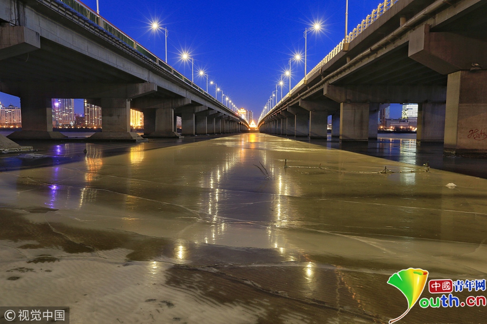 松花江封江 冰面如鏡倒影冰城夜景