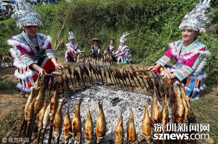 深圳新聞網(wǎng)訊  2018年9月15日,廣西柳州市融水苗族自治縣喜迎中國首屆“農(nóng)民豐收節(jié)”——2018金秋燒魚季啟動儀式在桿洞鄉(xiāng)花孖苗寨舉行,數(shù)百名苗族群眾和游人共同開展了水田拔河、田間捉魚、傳統(tǒng)打谷和燒魚等活動,慶祝豐收。