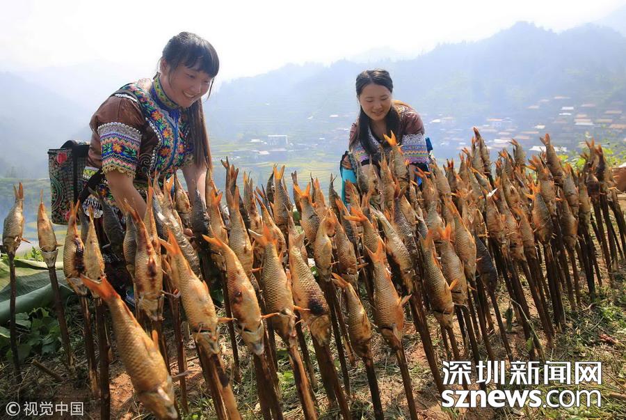 廣西柳州市融水縣山區(qū)有插秧時節(jié)放養(yǎng)鯉魚苗的習俗,金秋時節(jié)稻熟魚肥,收稻燒魚成為別致一景。