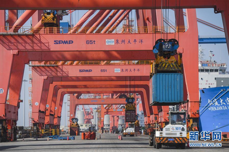 11月29日,在福建省石獅市蚶江鎮(zhèn)石湖港區(qū),泉州太平洋碼頭公司的大型機械在為一艘貨輪裝貨。 新華社記者 宋為偉 攝