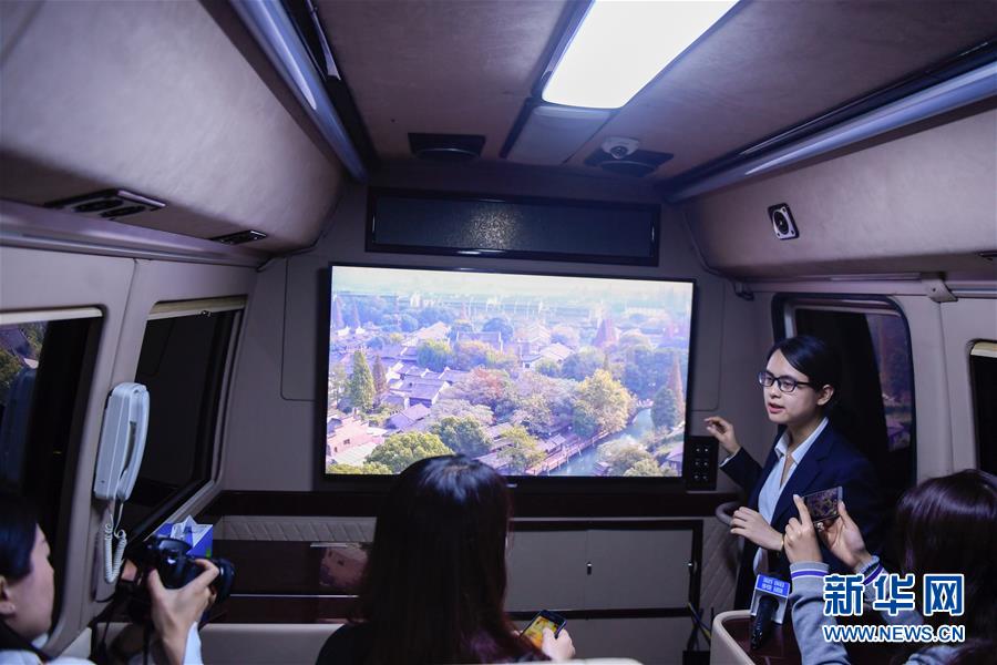 在浙江移動(dòng)烏鎮(zhèn)分水墩營(yíng)業(yè)廳外,工作人員在一輛體驗(yàn)巴士?jī)?nèi)介紹通過(guò)5G移動(dòng)傳輸技術(shù)實(shí)現(xiàn)的8K高清的視頻畫(huà)面實(shí)時(shí)展示(10月30日攝)。 新華社記者黃宗治攝