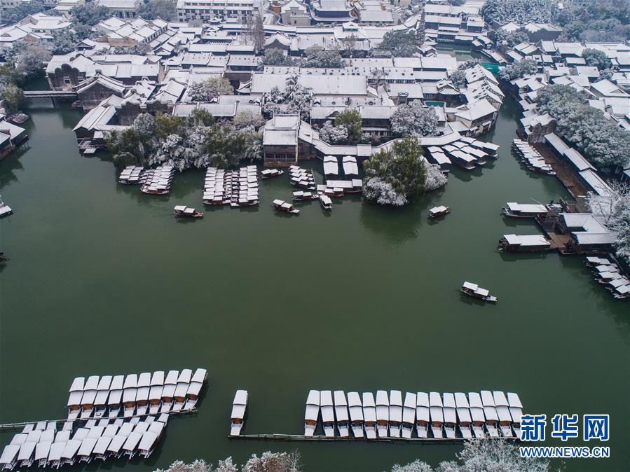 12月9日,空中俯瞰被白雪覆蓋的烏鎮(zhèn)景區(qū)(無人機(jī)拍攝)。 受冷空氣影響,浙江省桐鄉(xiāng)市迎來大范圍降雪,千年古鎮(zhèn)烏鎮(zhèn)被厚厚的白雪覆蓋。小橋流水、白墻黑瓦的江南水鄉(xiāng)古鎮(zhèn),呈現(xiàn)出冬日雪鄉(xiāng)的獨(dú)特韻味,吸引各地游客前來觀賞。 新華社記者 徐昱 攝