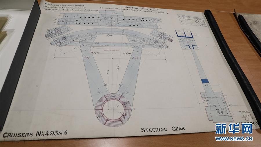 這是11月2日在英國(guó)紐卡斯?fàn)柕奶┒鳌枡n案館拍攝的致遠(yuǎn)艦設(shè)計(jì)圖紙。 新華社記者日前在紐卡斯?fàn)柼┒鳌枡n案館查找北洋海軍史料時(shí)發(fā)現(xiàn)一套七張、檔案名為“中國(guó)巡洋艦舵機(jī)設(shè)計(jì)圖”的原始圖紙。塵封百年,甲午海戰(zhàn)中抗擊日艦后沉沒(méi)的清北洋海軍致遠(yuǎn)艦部分原廠設(shè)計(jì)圖紙?jiān)谄浣ㄔ斓亍?guó)紐卡斯?fàn)柺械囊患覚n案館首次被發(fā)現(xiàn),為打撈那段悲壯的歷史提供了重要參考。 新華社記者 韓巖 攝