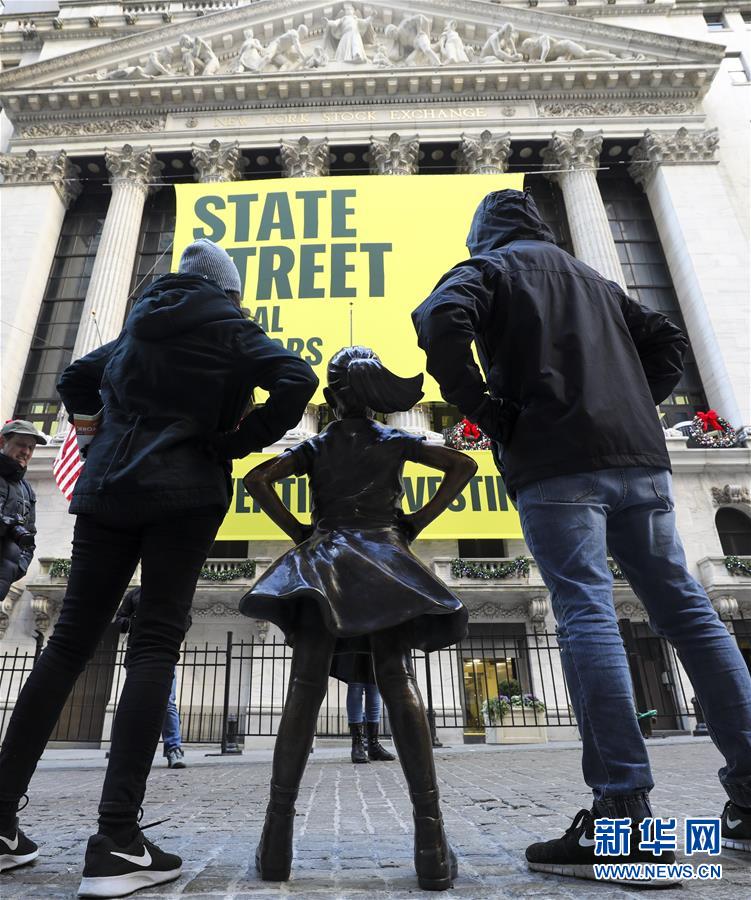這是12月10日在美國紐約證券交易所前拍攝的“無畏女孩”銅像。 新華社記者 王迎 攝