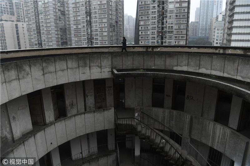 2018年12月6日,重慶江北紅旗河溝汽車(chē)站內(nèi),有一棟獨(dú)特的八層圓環(huán)狀建筑,底層每天有不少進(jìn)出站的客車(chē)通行。據(jù)悉,這棟樓建于1990年,曾經(jīng)是車(chē)站旅館,如今一、二兩層用于車(chē)站辦公,其余樓層已廢棄。為確保安全,三層以上已經(jīng)被封鎖。圖為公交車(chē)穿過(guò)8層空心圓筒樓。徐勇/視覺(jué)中國(guó)