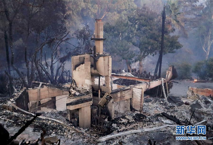 這是11月10日在美國加利福尼亞州馬里布市拍攝的一處被燒毀的廢墟。連日來,美國加利福尼亞州野火肆虐。 新華社記者李穎攝