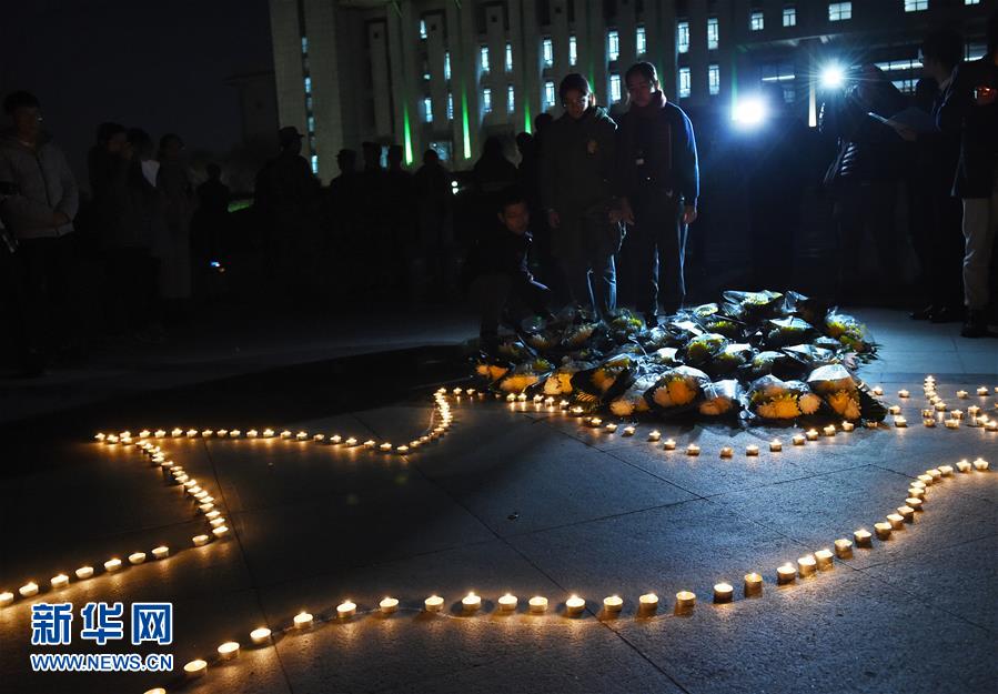 12月12日,學生在“燭光祭”活動現(xiàn)場獻花。 當晚,南京東南大學學生在校園舉行“燭光祭”活動,悼念南京大屠殺遇難同胞。學生們點燃白燭,獻花默哀,表達哀思。 新華社記者 孫參 攝